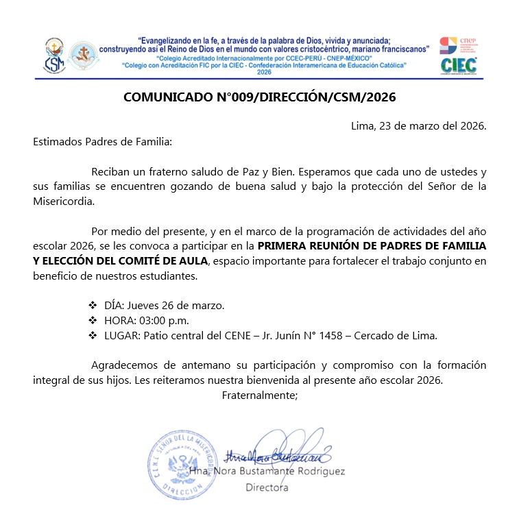 Mi saludo fraterno de paz y bien a todos los integrantes de la Comunidad Educativa del CENE Señor de la Misericordia, una I.E. de convenio entre el Estado Peruano y la Santa Sede y donde formamos a nuestros estudiantes de manera integral, brindándoles las herramientas necesarias para que sean: Buenas personas, buenos cristianos y buenos ciudadanos.